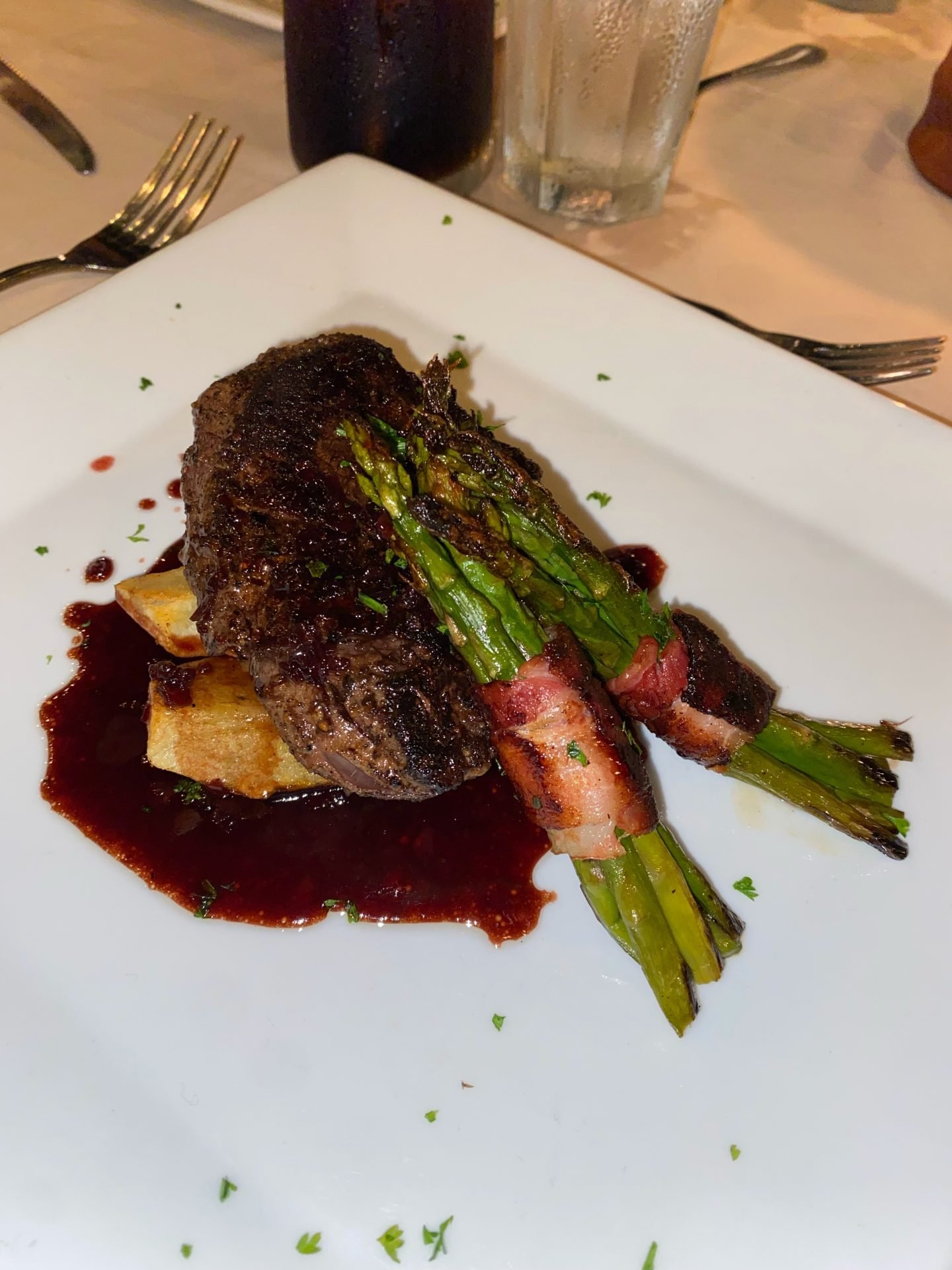String lights beneath coconut trees and tabletop oil lanterns greet the night, which makes an incredible ambiance for enhanced privacy and closeness. After all, you are on a private island in the middle of the Caribbean Sea in Belize. Dinner service rolls out three courses as the nightly custom, and that night, guests could choose between filet mignon with roasted potatoes and bacon-wrapped asparagus, or duck breast with a fresh cranberry sauce over sautéed veggies and purple yampi purée. And of course, dessert: cheesecake with a fresh strawberry compote.