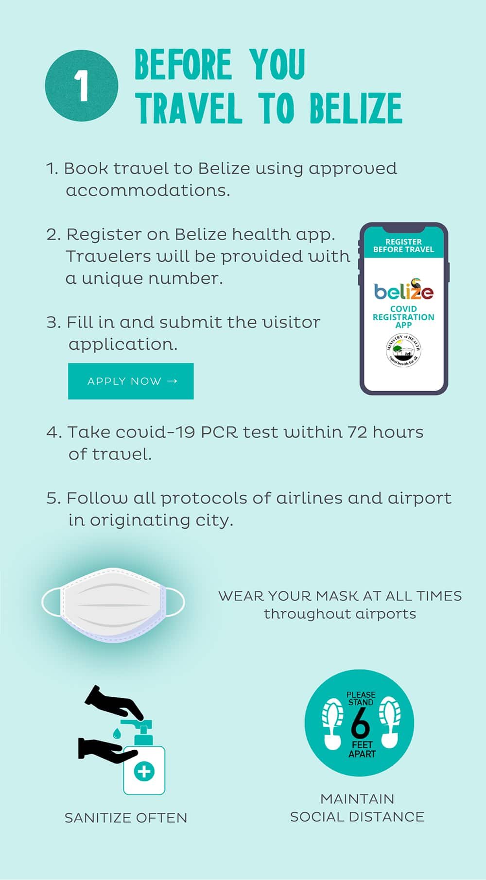 1. Before you leave: Book approved accommodations, register on the Belize Health App and complete required information within 72 hours of boarding your flight. Travelers must also take a COVID-19 PCR test within 72 hours of travel.