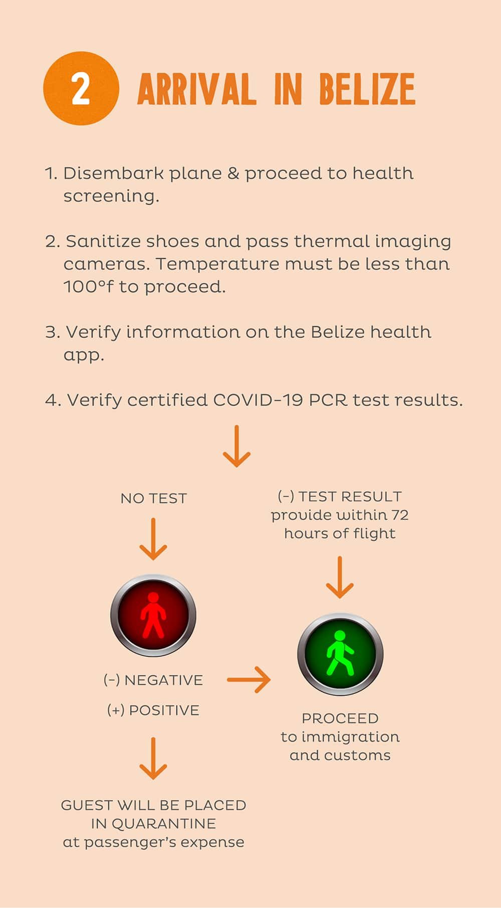 2. Arrival in Belize: Proceed to health screening, pass thermal imaging and undergo a temperature check. Travelers must verify their unique ID code on their Belize Health App and verify their negative COVID-19 PCR test results. However if they have not taken a test prior to flying, they will be required to test upon arrival for US$50.00, at their own expense. If negative, travellers can proceed to immigration and customs; if positive, they will be placed in quarantine for 14 days at their own expense.