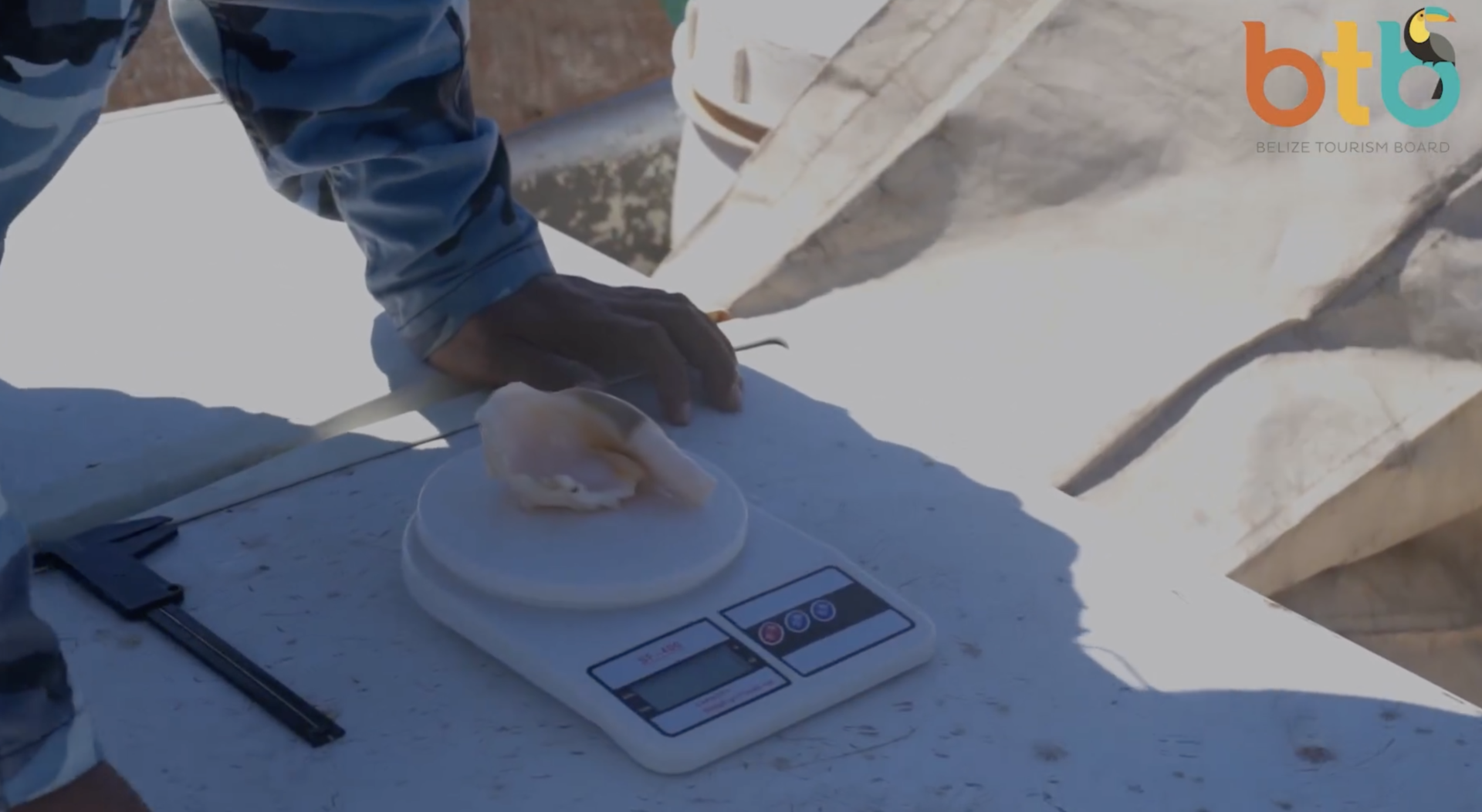 Captain Dwayne Garcia checks the weight of caught conch.