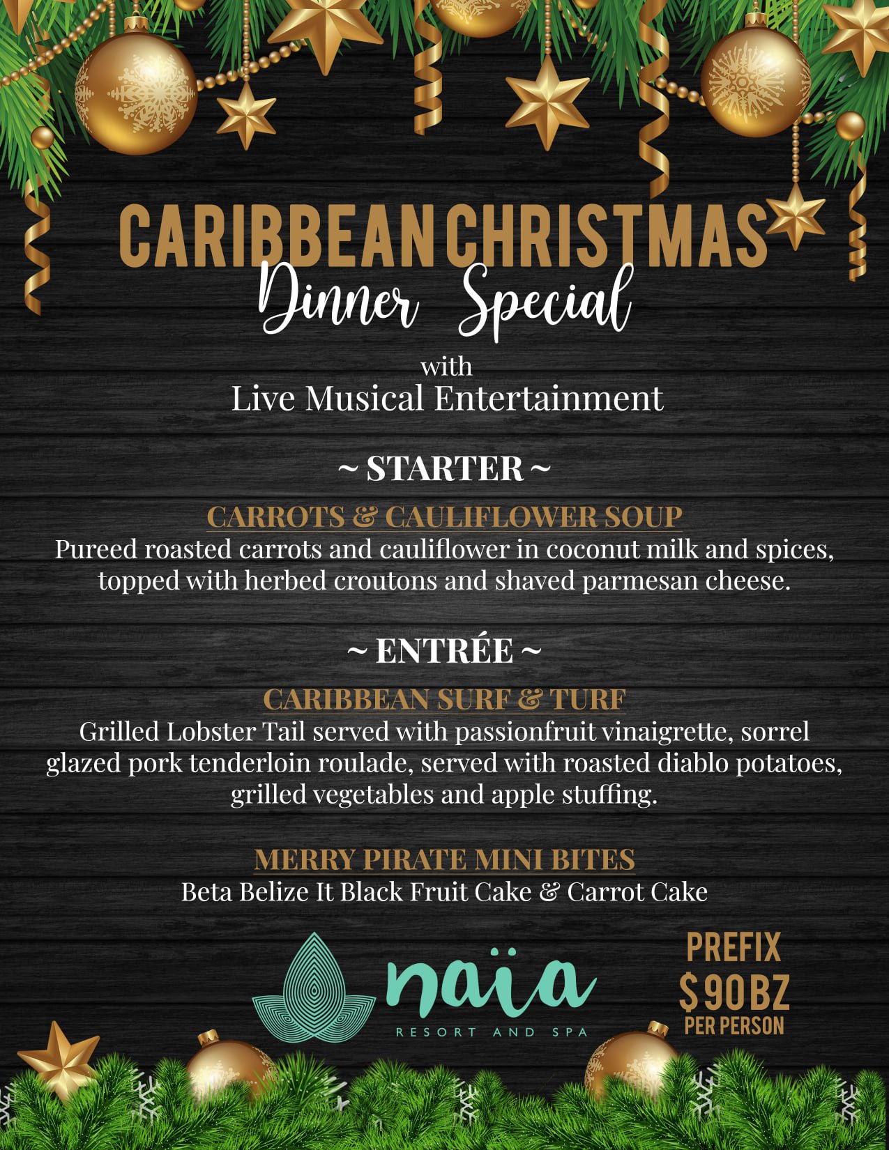 Celebrate the magical season with Naia Resort’s special Caribbean Christmas or New Year’s Eve dinner menus of festive classics and delights! Set on a stretch of private Placencia coastline, head to the Beach Bar & Grill on Saturday, December 25, or Friday, December 31, to enjoy a cozy evening while Naia takes care of the rest.