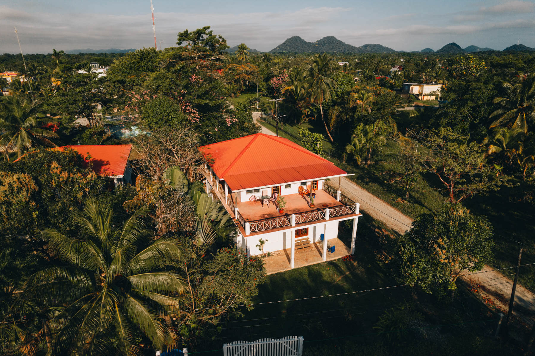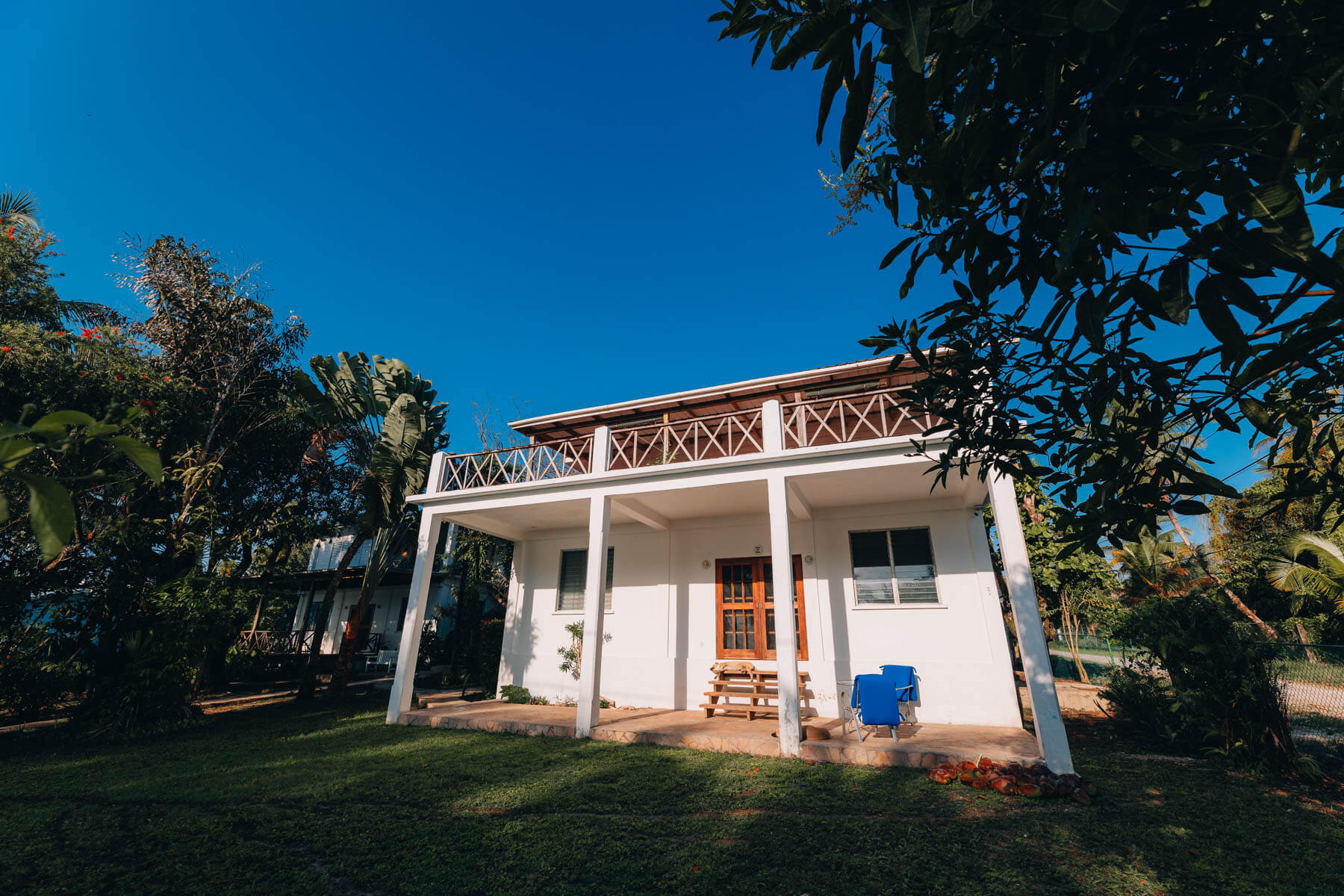 The property is comprised of two structures on a beautifully landscaped corner double lot that is perched atop the highest coastal land in Belize and overlooks the sea. The guesthouse conveys a light and airy atmosphere that is highlighted by stone walkways that lead to both structures and wooden stairs and walkways that link the two buildings.